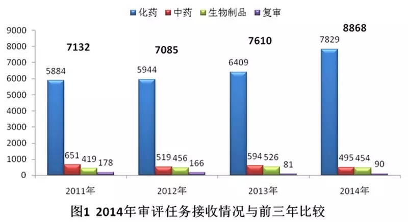 2014年,药审中心接收新的注册申请8868个(以受理号计,下同)。与既往年度接收注册申请的比较情况见图1。