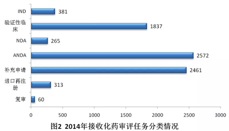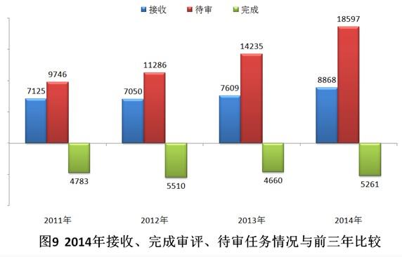 2014年,药审中心共完成5261个注册申请的技术审评,比2013年的审评完成量增加了12.9%,但接收任务量较2013年增加了16.5%,待审任务积压量进一步增加。2014年接收、完成审评、待审任务情况与前三年比较见图9。