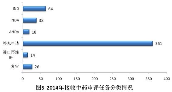 2014年共接收中药注册申请521个,其中69.3%为补充申请。具体见图5。