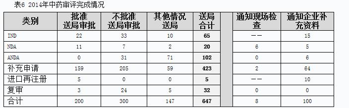 2014年中药完成审评并呈送总局审批的注册申请共647个,另有完成审评已通知现场检查的注册申请8个,完成审评通知企业补充资料的注册申请100个。具体情况见表6。