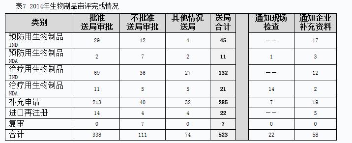 2014年完成生物制品审评并呈送总局审批的注册申请共523个,另有完成审评已通知现场检查的注册申请22个,完成审评通知企业补充资料的注册申请58个。具体情况见表7。